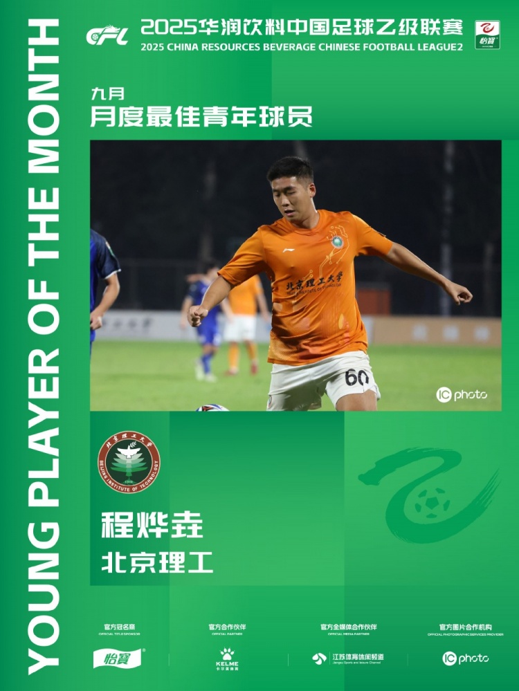 中乙官方:北理工球员程烨垚获9月最佳青年球员,贡献3球2助攻