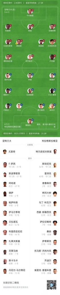 亚特兰大首发:29-卡内塞基、3-科索努、4-希恩、19-吉姆西蒂、77-扎帕科斯塔、15-德容恩、13-埃德森、47-贝纳斯科尼、17-德凯特拉雷、11-卢克曼、90-克尔斯托维奇