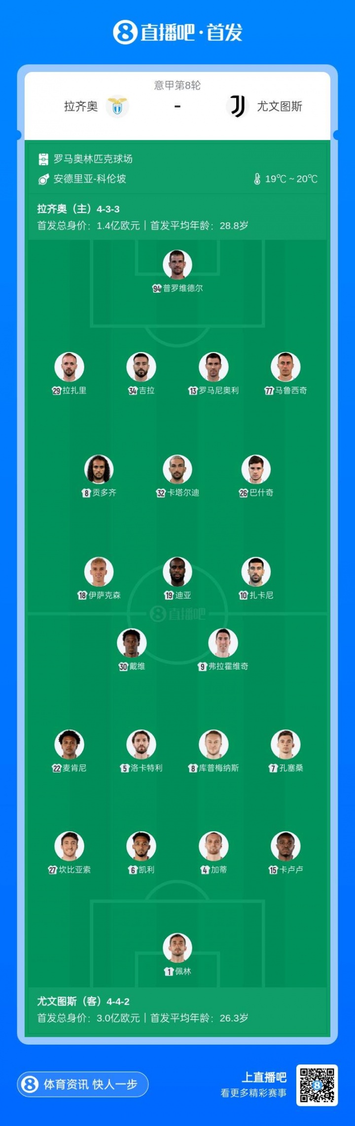 10月27日讯 意甲第8轮,拉齐奥对阵尤文图斯,赛前首发公布。